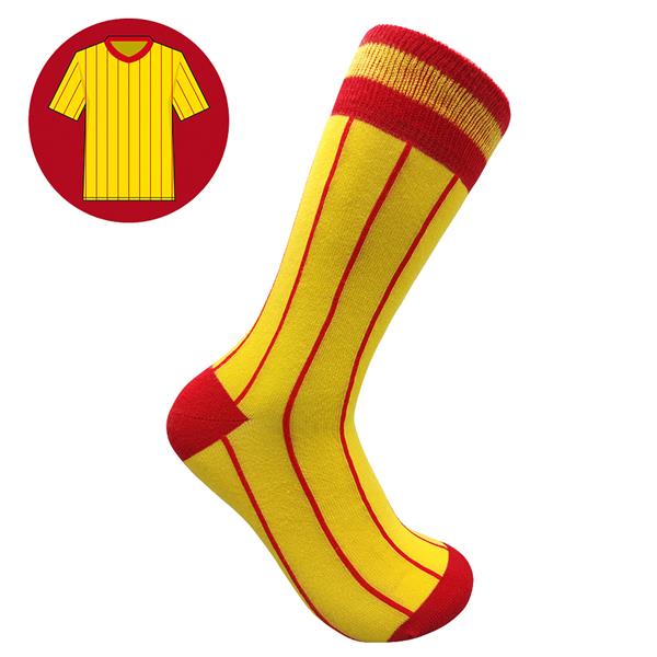 Our 1982 Liverpool Retro Shirt Socks are inspired by one of their most disctintive away kits. The Yellow away shirt from the 1982 season had thin red vertical lines running through it. The shirt was also sponsored by Crown Paints and adorned by such superstars like Ronnie Whelan, Graeme Souness, and Kenny Dalglish. After ending fifth the previous season Liverpool came back and won their thirteenth league title, after being twelfth in the league table at Christmas. They also won the league cup that season.